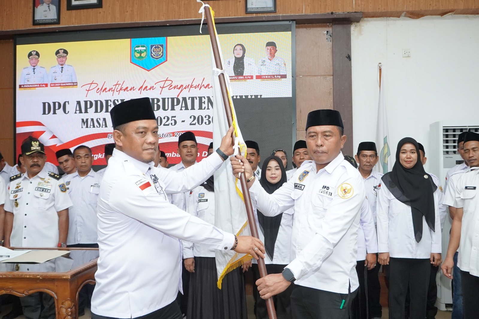 Penyerahan Pataka APDESI oleh Bupati Luwu H Patahudding, kepada Ketua terpilih DPC APDESI Kabupaten Luwu, Ismail, pada acara pelantikan dan pengukuhan pengurus masa bakti 2025–2030 di Aula Rumah Jabatan Bupati Luwu, Rabu (20/8/2025). (ist)
