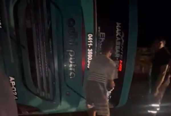 Bus Adhi Putra itu tergelincir dan terbalik saat melaju dari Morowali, Sulawesi Tengah, menuju Makassar, Sulawesi Selatan.