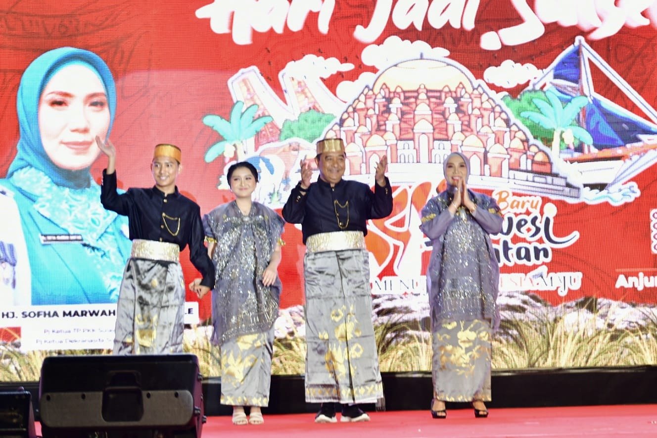 Pj Gubernur Sulsel, Bahtiar Baharuddin, didampingi Pj Ketua TP PKK, Sofha Marwah Bahtiar, beserta kedua anaknya, tampil sebagai pembuka gelaran Fashion Show, dengan mengenakan baju adat berwarna silver, karya desainer asal Kota Makassar, Wawan Gold.