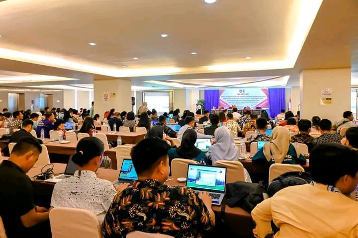 Peserta mengikuti pelatihan dengan laptop masing-masing sambil mengikuti bimbingan pelatih melalui tiga layar lebar dalam ruangan.