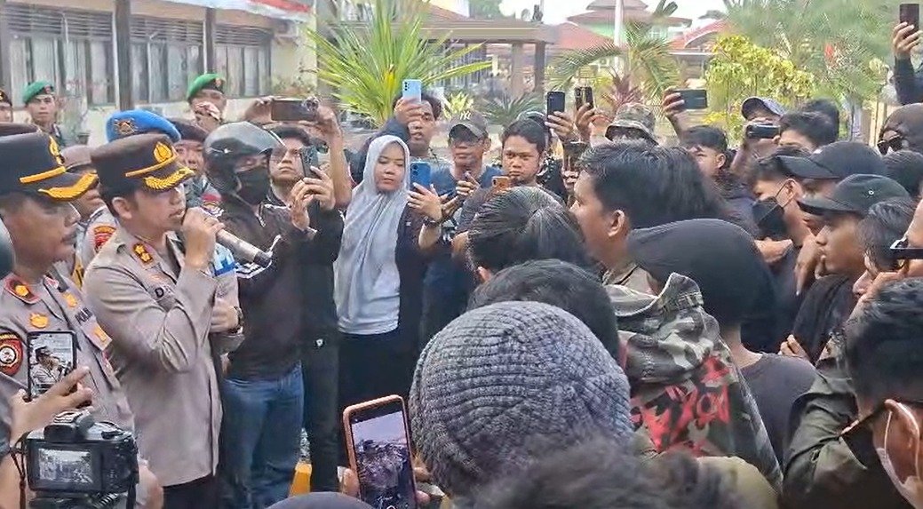 Kapolres Palopo, AKBP Surya Dharma, saat menemui massa,  Sabtu (30/8/2025). Ia berjanji aparatnya tidak akan menggunakan cara-cara represif dalam menghadapi demonstrasi. (ist)