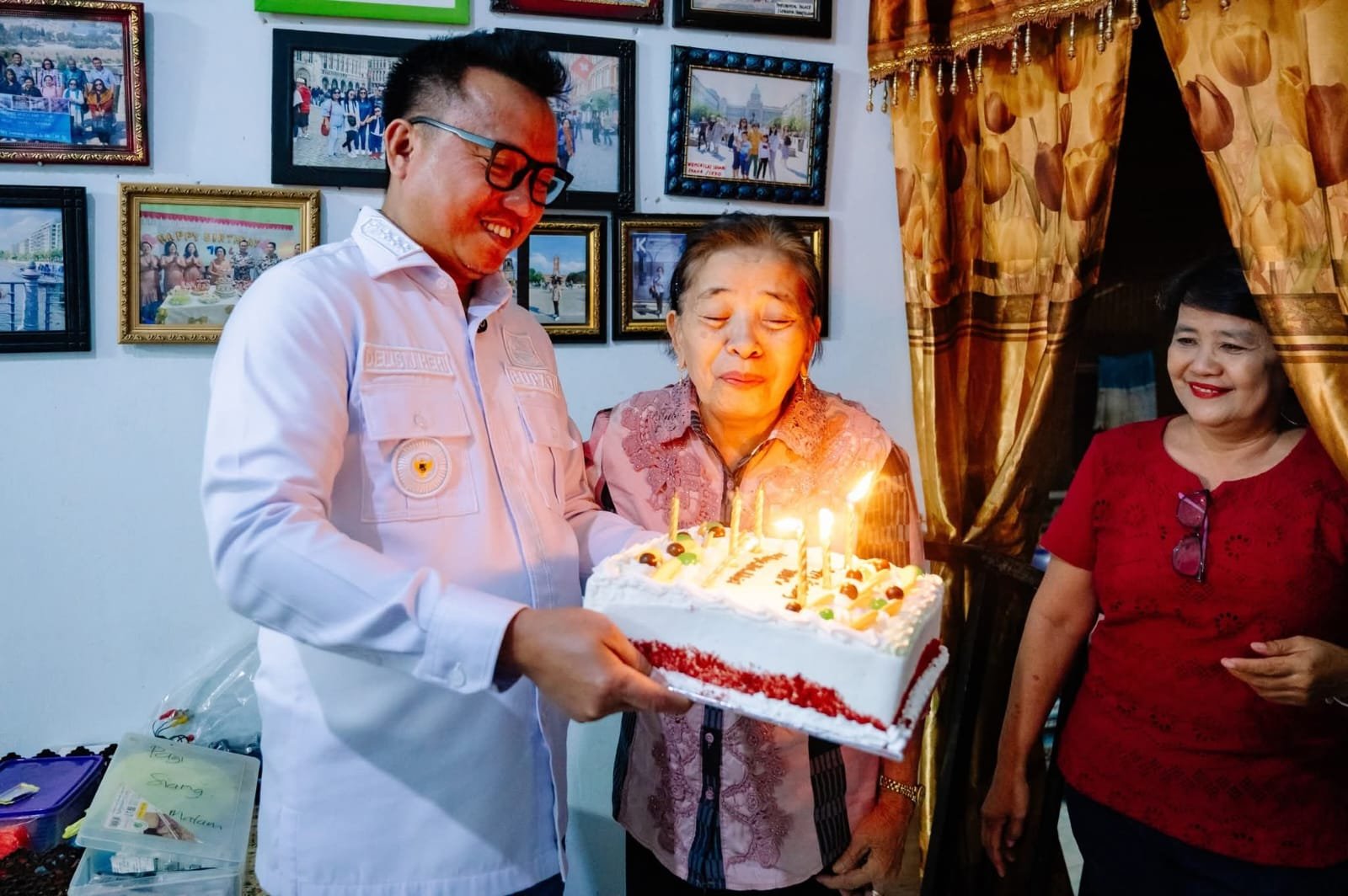 Dengan penuh kasih, Bupati Delis datang membawa kue sederhana bertuliskan ucapan manis dari cucu-cucu “Happy Birthday ‘Oma’ dari: Angie, Abel, dan Adriel”.