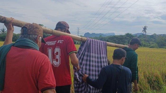 Seorang perempuan lansia terpaksa ditandu sejauh dua kilometer melintasi pematang sawah demi mendapatkan pertolongan medis.