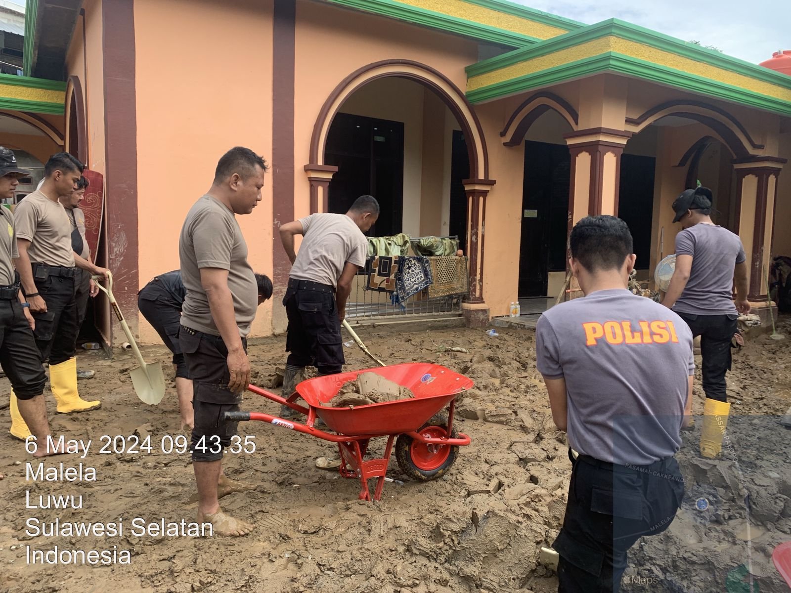 Ada beberapa titik dilakukan pembersihan. Pertama Personel Polres Palopo melakukan Kurvei di Mesjid Nurul Haq Desa Malela, Kecamatan Suli, Luwu.