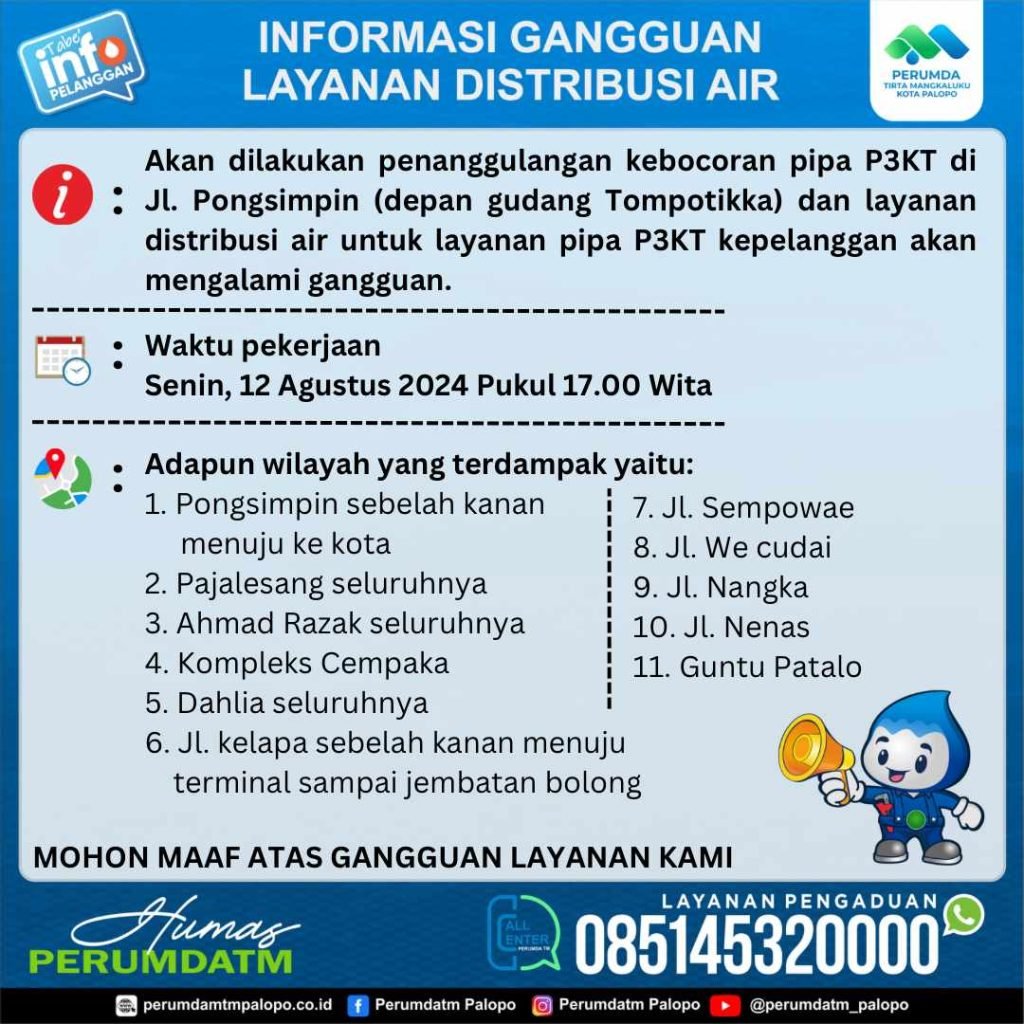 “akan dilakukan penanggulangan kebocoran pipa P3KT di Jalan Pongsimpin (depan Gudang Tompotikka) dan layanan distribusi air akan mengalami gangguna,” tulis Perumda TM Palopo.
