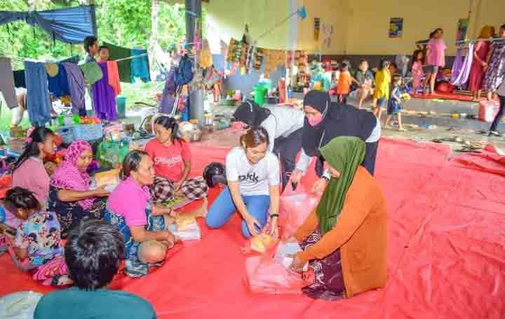 Istri Bupati Morut ini, ikut berbasah-basah saat membagikan makanan di pemukiman penduduk yang masih terendam.
