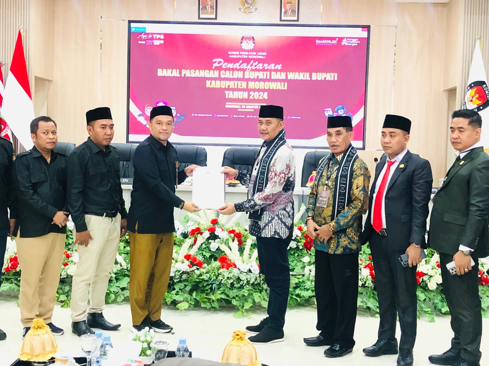 Pasangan bakal calon (paslon) Bupati dan Wakil Bupati Morowali, Rachmansyah Ismail-Harsono Lamusa saat mendaftar ke KPU Morowali, Rabu 28 Agustus 2024. (ist)