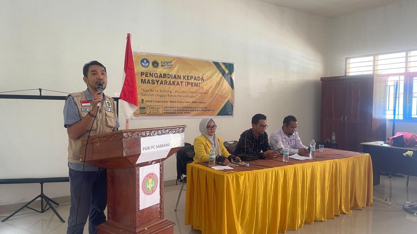 PALOPO, TEKAPE.co – Dalam upaya menciptakan lingkungan sekolah yang aman dan bebas dari perundungan (bullying), Tim Pengabdian kepada Masyarakat (PKM) dari Program Studi Pendidikan Pancasila dan Kewarganegaraan (PPKn), Fakultas Keguruan dan Ilmu Pendidikan (FKIP), Universitas Cokroaminoto Palopo (UNCP) menggelar sosialisasi anti-bullying.