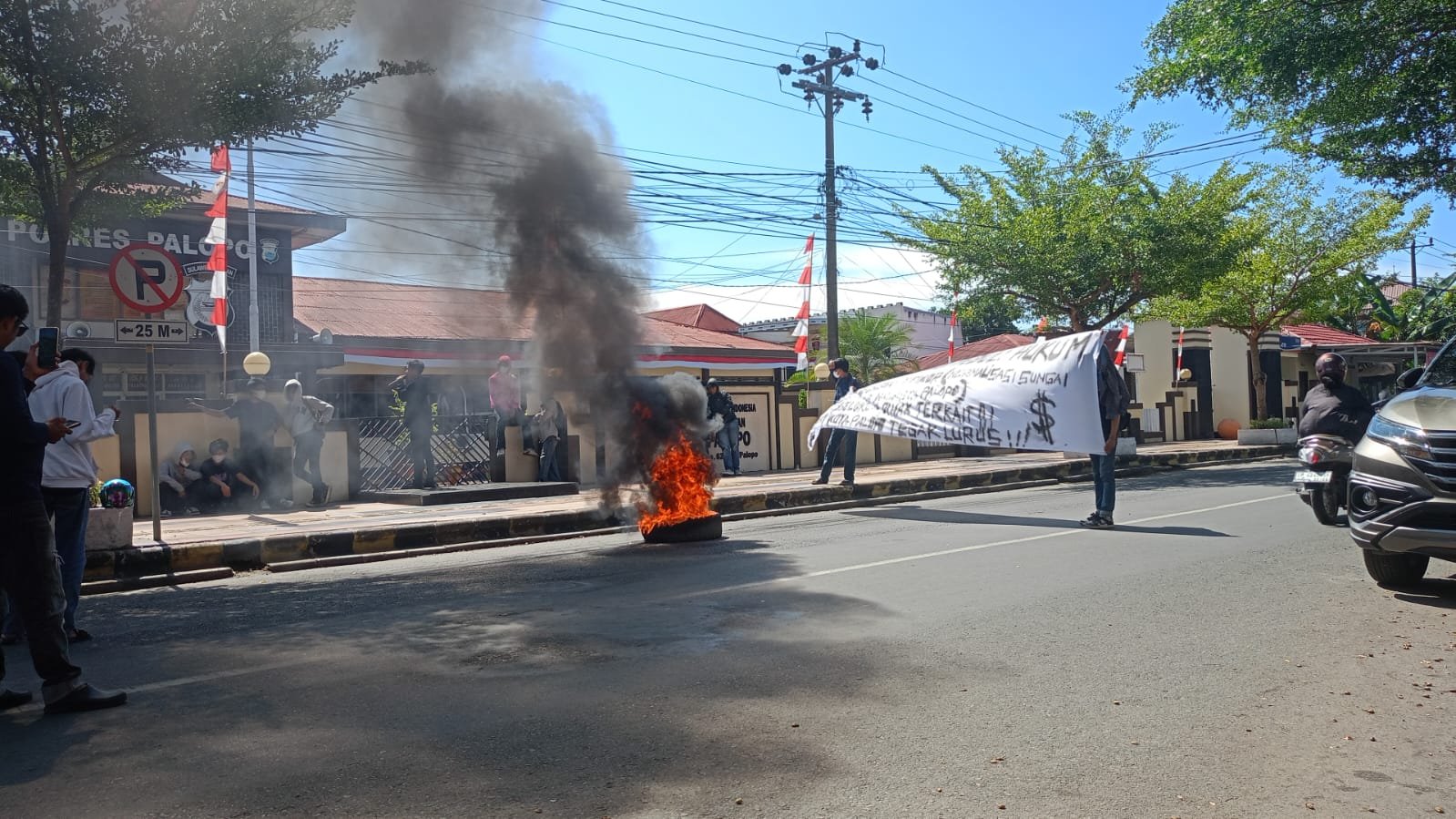 Aksi berlangsung selama dua jam dan diwarnai dengan pembakaran ban serta orasi bergantian di bawah spanduk berisi tuntutan.