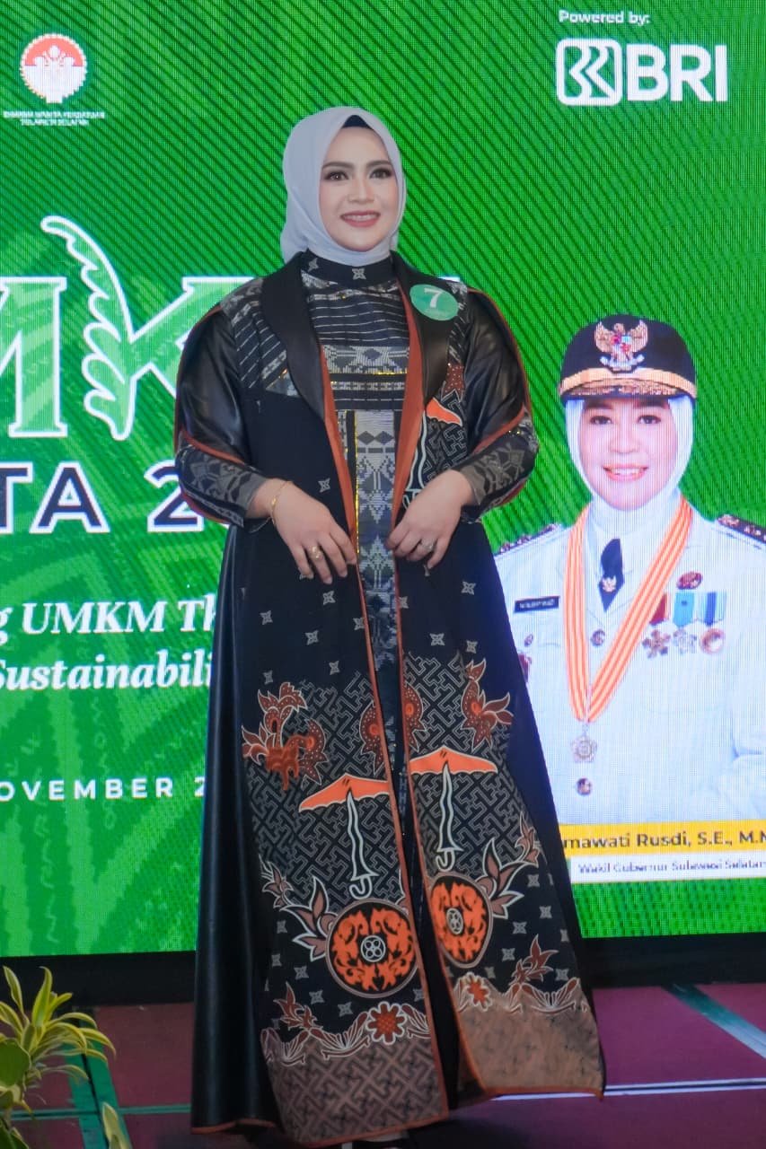 MAKASSAR, TEKAPE.co – Wakil Ketua Dewan Kerajinan Nasional Daerah (Dekranasda) Kabupaten Luwu, Nilasari Dhevy Bijak, menampilkan gaun bermotif khas Luwu dalam sesi fashion show UMKM FI3STA 2025 yang berlangsung di Hotel Mercure Makassar, Jumat, 14 November 2025.